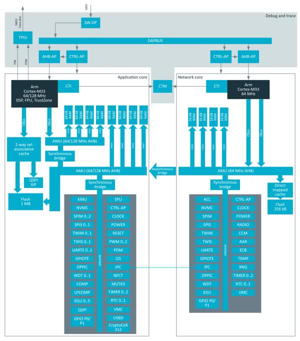 Unikalną cechą układu scalonego nRF5340 firmy Nordic Semiconductor jest zastosowanie dwóch takich samych rdzeni ARM CortexM33 jako rdzeń aplikacyjny i komunikacyjny [5].
