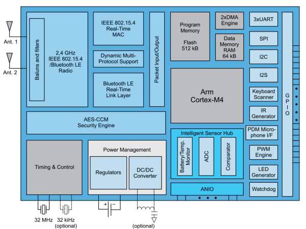 Wiele układów scalonych ma budowę dwurdzeniową. Drugi rdzeń pracuje niezależnie i standardowo obsługuje komunikację bezprzewodową (procesor sieciowy). Najczęściej, jako drugi, stosowany jest rdzeń ARM CortexM0 lub CortexM0+. Obsługa komunikacji realizowana jest programowo z kodem umieszczonym w pamięci ROM, z możliwością zastosowania kodu z pamięci Flash i rekonfiguracji radia, włącznie z własnym protokołem.