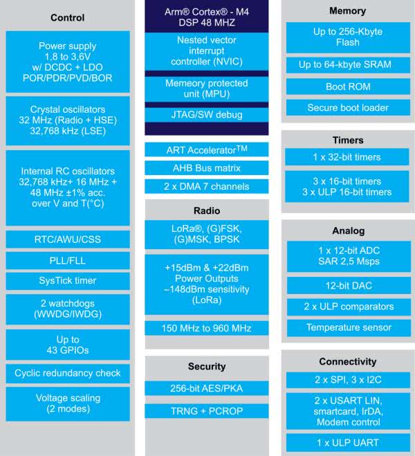 STM32WL firmy ST Microelectronics jest w pełni otwarty i obsługuje multimodulację, co czyni go idealnym wyborem do rozwiązań LPWAN i IoT z wyjątkowo niskim zużyciem energii bez utraty wydajności. Układ jest zbudowany z zastosowaniem rdzenia ARM Cortex-M4 (48 MHz) z pamięcią RAM 32 kB, RAM niskiej mocy 8 kB, Flash 256 kB [32] (rysunek 22). Wybrane parametry układu: