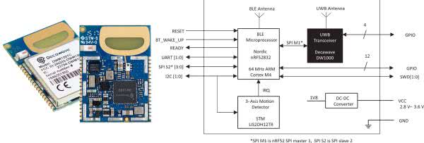 Moduł DWM1001C firmy Decawave łączy w sobie moduł DW1000 firmy Decawave, układ SoC nRF52832 Nordic Semiconductor i 3-osiowy akcelerometr (STM LIS2DH12TR) [17] (rysunek 24). DWM1000 to bezprzewodowy moduł nadawczo-odbiorczy zgodny ze standardem IEEE802.15.4-2011 UWB. nRF52832 obsługuje Bluetooth LE 5.2, detekcję kierunku oraz Bluetooth Mesh. Każdy moduł można skonfigurować jako sensory (anchor) RTLS lub tag, a dodatkowo może działać jako urządzenie bramy sieciowej. Umożliwia lokalizację obiektów w systemach lokalizacji w czasie rzeczywistym (RTLS) z dokładnością do 10 cm w pomieszczeniach (schematy lokalizacji ToF i TDoA), komunikację z dużą szybkością (do 6,8 Mb/s) i doskonały zasięg komunikacji do 300 m dzięki spójnym technikom odbiornika. Przy napięcie zasilania 2,8 do 3,6 V moduł pobiera bardzo mało mocy: tryb głębokiego uśpienia 4 μA.