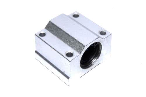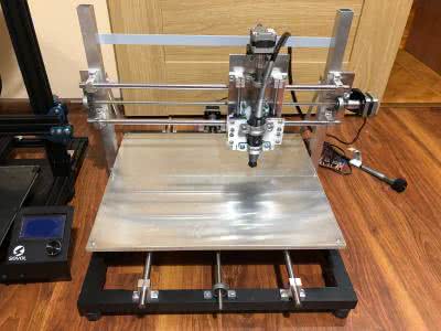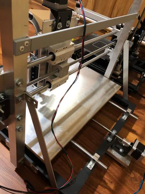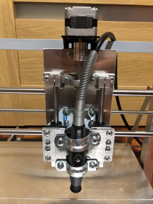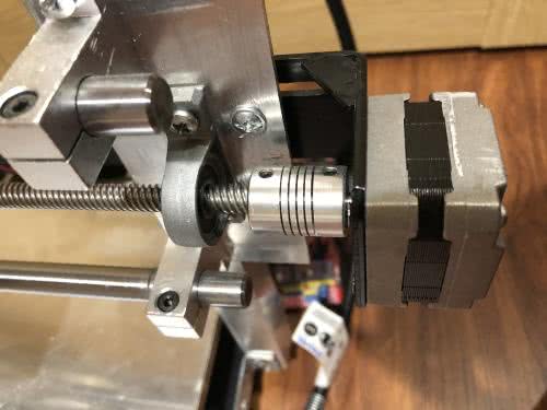 Tak powstała maszyna o polu roboczym 400×400×150 mm. Do jej budowy zastosowałem profile aluminiowe 25×25 mm o grubości ścianki 1,5 mm. Jednak lepszym rozwiązaniem do budowy takiej maszyny byłyby profile 2020 i 2040 V-slot (fotografia 12), na których dużo łatwiej wypoziomować elementy. Stół zamontowany jest na czterech łożyskach liniowych SC12UU (fotografia 13), które poruszają się po wałkach ∅ 12. Stół napędzany jest silnikiem krokowymi NEMA 17 o kącie 1,8° na krok (fotografia 14). Silnik połączony jest ze stołem za pomocą śruby trapezowej. Do połączenia wału silnika ze śrubą użyłem sprzęgła elastycznego (fotografia 15), ponieważ nie chciałem dopuścić, aby jakiekolwiek niedopasowanie między wałem silnika a śrubą uszkodziło konstrukcję. Śruba ze stołem jest połączona za pomocą nakrętki trapezowej i bloku (fotografia 16). Po podłączeniu silnika do Arduino za pomocą drivera i przetestowaniu mogłem przejść do kolejnego etapu.