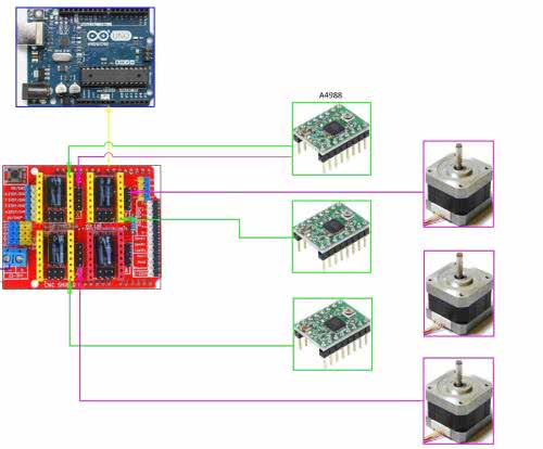 Mikrokontroler ATmega 328P modułu Arduino Uno odpowiada za sterowanie wszystkimi podzespołami. Dodatkowo użyłem CNC Shield, który pozwolił dołączyć drivery oraz silniki w łatwy sposób. Schemat blokowy połączenia wszystkich elementów pokazuje rysunek 2.