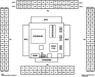 Za wyborem tego rozwiązania przemawia również fakt, iż w skład zestawu wchodzi nie tylko sam układ ICE40, ale również dodatkowy mikrokontroler STM32F730 taktowany zegarem 200 MHz, który jest połączony z FPGA za pomocą dwóch magistral SPI. Dodatkowo do dyspozycji mamy pamięć SDRAM, oraz FLASH-SPI, co umożliwia tworzenie zaawansowanych rozwiązań, jak na przykład implementacja własnych układów SOC.