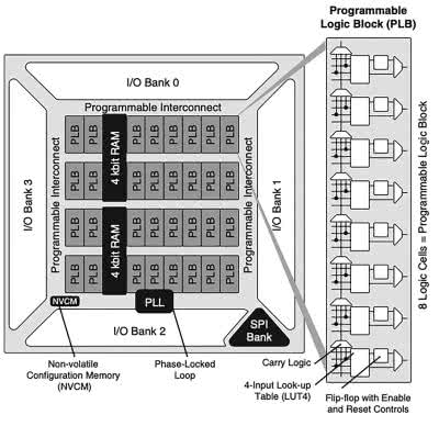W układzie dodatkowo mamy pętlę PLL, dzięki czemu istnieje możliwość powielenia sygnału zegarowego pochodzącego z dowolnego wejścia IO. Sprzętowy kontroler SPI pełni podwójną rolę, z jednej strony służy do konfiguracji układu, natomiast po zakończeniu konfiguracji jest dostępny jako blok wewnętrzny i może służyć np do obsługi pamięci szeregowej.