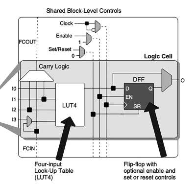 Każda makrokomórka zbudowana jest w oparciu o blok LUT4 który pozwala zrealizować dowolną funkcję logiki kombinacyjnej z maksymalnie 4 wejściami. Wyjście bloku LUT połączone jest z wejściem przerzutnika typu D z opcjonalnym wejściem zezwolenia na sygnał zegarowy oraz wejściem SR, które jest dołączone do globalnej linii reset (rysunek 4). Dodatkowy blok logiczny sumatora zwiększa efektywność implementacji funkcji arytmetycznych.