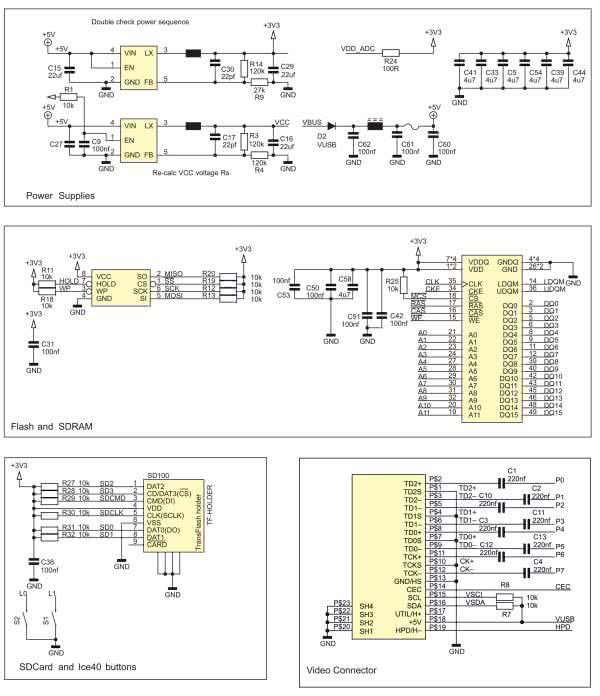 Schemat ideowy zestawu został pokazany na rysunku 1. Zasilana doprowadzane jest bezpośrednio z portu USB za pomocą złącz USB-COM lub USB-PRG. Napięcie z portu USB po odfiltrowaniu podawane jest na dwa stabilizatory impulsowe dostarczających napięć 1,2 V do zasilania rdzenia FPGA (Vcc) oraz 3,3 V do zasilania części IO FPGA oraz mikrokontrolera.