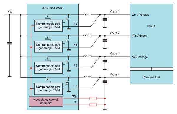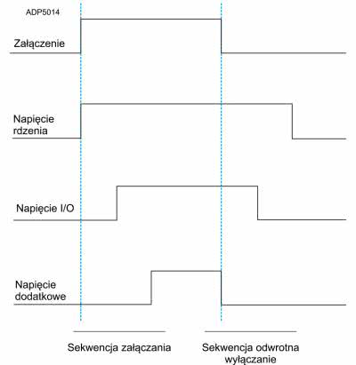 Najprostszy system sekwencjonowania załączania napięć można łatwo wykonać za pomocą pinów włączających (enable) w standardowych przetwornicach DC/DC. Jednak zwykle wymagane jest również kontrolowane sekwencjonowanie w czasie wyłączania urządzenia. Trudno jest osiągnąć dobry wynik w takiej aplikacji z użyciem tylko pinów kontrolujących pracę układów. Lepszym rozwiązaniem jest użycie układu typu PMIC z zaawansowanymi zintegrowanymi funkcjami sekwencjonowania, takiego jak na przykład ADP5014. Specjalny blok obwodu, który umożliwia regulację kolejności sekwencji podczas załączania i wyłączania napięć, jest zaznaczony na czerwono na rysunku 2.