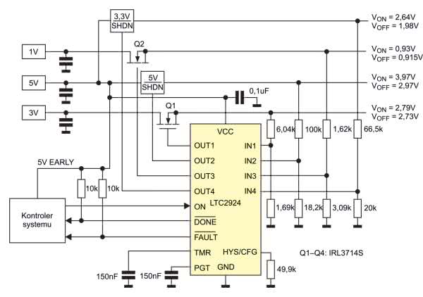 Na rysunku 4 pokazano przykładową aplikację układu LTC2924 w systemie sekwencjonującym zasilanie.