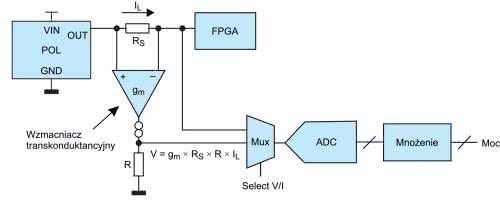 Monitorowanie napięć zasilania, prądów i ewentualne wykrywanie usterek czy anomalii w zachowaniu FPGA ma zasadnicze znaczenie dla zrozumienia stanu systemu i zużycia energii w różnych scenariuszach, ponieważ FPGA jest mózgiem systemu elektronicznego. Takie zrozumienie, w połączeniu z możliwością zmiany napięcia podczas pracy, pozwala uniknąć wielokrotnego poprawiania projektu, oszczędzając koszty i energię. Co więcej, awaria systemu może objawiać się, jako nienormalny trend w zużyciu energii FPGA, ostrzegając kontroler hosta lub personel serwisowy przed awarią płyty lub systemu. Monitorowanie napięcia wymaga przetworników ADC, podczas gdy monitorowanie prądu wymaga również dodatkowych obwodów pomiarowych w postaci wzmacniacza pomiarowego, do pomiaru spadku napięcia na oporniku pomiarowym po wysokiej stronie linii zasilania. Można zastosować np. op-amp w konfiguracji wzmacniacza transkonduktancyjnego, jak pokazano na rysunku 7.