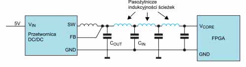 Na rysunku 10 została pokazana ta koncepcja. Chociaż stabilizator POL zwykle znajduje się blisko obciążenia, często między stabilizatorem, a kondensatorem wejściowym FPGA znajduje się ścieżka na płytce drukowanej. Gdy na płycie znajduje się kilka kondensatorów wejściowych FPGA obok siebie, te najbardziej oddalone od zasilacza będą miały mniejszy wpływ na funkcję przejścia pętli stabilizatora, ponieważ występuje między nimi pewna rezystancja, ale także pasożytnicza indukcyjność ścieżki. Te pasożytnicze indukcyjności PCB mogą pozwolić na to, aby pojemność wejściowa FPGA była większa niż maksymalny limit pojemności wyjściowej dla danego zasilacza, nawet, jeśli wszystkie kondensatory są podłączone do tego samego węzła na płycie. W programie LTspice do schematu można dodać pasożytnicze indukcyjności ścieżek i takie efekty również można symulować. Wyniki symulacji są zbliżone do rzeczywistości, gdy w modelowaniu obwodu uwzględnione zostaną komponenty pasożytnicze.
