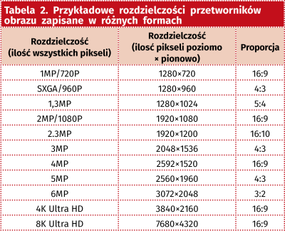 Określa zdolność przetwornika do odwzorowywania drobnych szczegółów obrazu. Im większa rozdzielczość tym obraz dokładniej odwzorowany. Zwykle wyrażana jest w ilości pikseli w osiach poziomej i pionowej przetwornika, jednak czasami podawana jest jako ilość wszystkich pikseli przetwornika. Im większa rozdzielczość, tym większy obraz wytwarza kamera. W tabeli 2 zestawiono przykładowe rozdzielczości przetworników zapisane na oba sposoby.