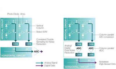 Podstawową wadą sensorów CMOS był wysoki poziom szumów przez co obraz (zwłaszcza zdjęcia) był gorszej jakości. Część tych zakłóceń powstawała podczas transportu sygnału analogowego z pikseli do przetwornika. Inżynierowie Sony podjęli działania w celu opracowania struktury o zminimalizowanych szumach. Efektem prac była technologia CMOS Exmor. Zasadniczym udoskonaleniem było zastosowanie niezależnych układów redukcji szumów i przetwarzania analogowo cyfrowego dla każdej kolumny matrycy. Porównanie budowy klasycznej matrycy CMOS i Exmor CMOS zostało pokazane na rysunku 14.