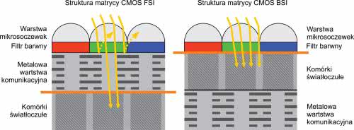 Powoduje dużą utratę fotonów, które muszą najpierw przebić się przez tę warstwę zanim dotrą do matrycy światłoczułej. Lepsze rozwiązanie zastosowano w matrycach CMOS BSI (Back–Illuminated Structure). Jest to nowy rodzaj architektury, w którym warstwy metalu i dielektryków zostały umieszczone pod warstwą światłoczułą, tworząc w ten sposób bardziej bezpośrednią drogę dla światła w kierunku piksela (rysunek 13b).