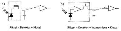 Charakteryzuje się dużym, sięgającym 80% współczynnikiem wypełnienia matrycy powierzchnią aktywną ale też mniejszą szybkością odczytu. Nowocześniejszym rozwiązaniem jest matryca z pikselami aktywnymi APS (active pixel sensor). Taki układ składa się z detektora, wzmacniacza przetwarzającego ilość ładunku na napięcie i tranzystora przełączającego (rysunek 12b). Umieszczenie przedwzmacniacza w pikselu aktywnym powoduje zwiększenie wymiarów matrycy i zmniejszenie współczynnika wypełnienia matrycy do wartości 30...50% ale przyspiesza odczyt treści matrycy.