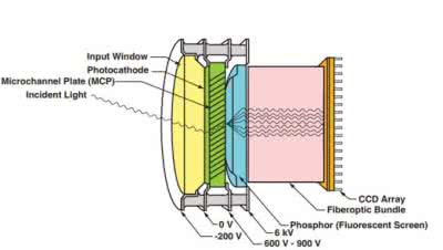 Innym rodzajem przetwornika CCD, który również odznacza się wysoką czułością to przetwornik ze wzmacniaczem obrazu ICCD (Intensified CCD). Wzmacniacz obrazu jest zamontowany przed matrycą CCD. Zawiera trzy elementy funkcjonalne: fotokatodę, płytkę mikrokanalikową MCP (Micro-Channel Plate) i ekran fosforowy, zamontowane jeden za drugim (rysunek 10).