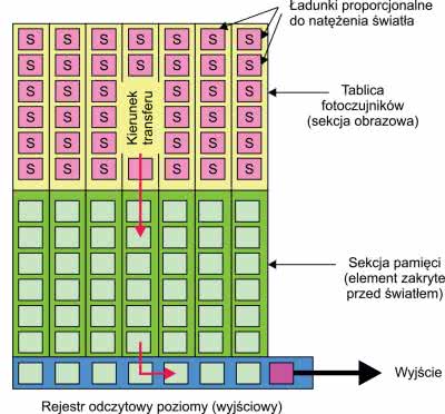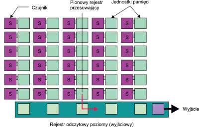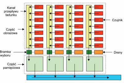 Lepszym rozwiązaniem, wymagającym jednak bardziej złożonej konstrukcji, jest matryca z transferem ramki FT (Frame Transfer), której uproszczony schemat budowy został pokazany na rysunku 5. Oprócz sekcji czujników na których jest rejestrowany obraz, zawiera dodatkową sekcję pamięci zasłoniętą przed oświetleniem, o takiej samej liczbie komórek jak matryca sensorów. Po zebraniu ładunków, następuje ich przesuniecie do sekcji pamięci. Proces ten uwalnia sensory, umożliwiając im gromadzenie ładunku pochodzącego z oświetlenia następnej ramki. Zawartość pamięci jest w tym czasie przesuwana do rejestru wyjściowego jak w trakcie normalnego transferu.