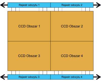 Transfer jest procesem czasochłonnym, dlatego powstały różne rozwiązania mające na celu zabezpieczenie zawartości pikseli przed wpływem oświetlania w czasie transferu oraz przyspieszające transfer. Najprostszą metodą było podzielenie obszaru matrycy np. na 4 części i dodanie oddzielnych kanałów transferu ładunku, co umożliwiało równoczesny odczyt wszystkich obszarów (rysunek 4).