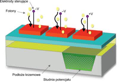 Jedną okładzinę stanowi przewodząca i jednocześnie przepuszczająca światło warstwa krzemu. Pełni ona rolę elektrody sterującej – przyłożenie dodatniego potencjału powoduje powstanie obszaru zubożonego. W reakcji na padające światło, podobnie jak w fotodiodzie, generowane są elektrony i zatrzymywane w warstwie zubożonej. Jest ona nazywana studnią potencjału (rysunek 3).