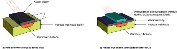 Piksele mogą być wykonane jako fotodiody, w których struktura krzemowa typu P-N jest spolaryzowana zaporowo (rysunek 2a). Padające światło powoduje generowanie elektronów o całkowitym ładunku proporcjonalnym do padającego światła, które zostają zatrzymane w warstwie zubożonej. Jednak częściej jest spotykane rozwiązanie z pikselami wykonanymi jako kondensatory MOS (rysunek 2b).