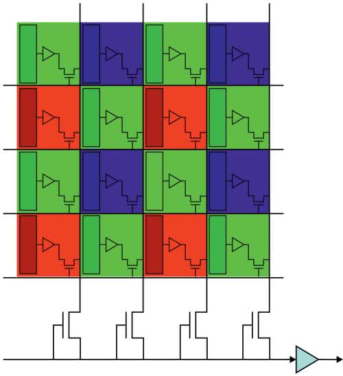 - Dzięki filtrom napylonym w trakcie procesu produkcji na elementy światłoczułe lub umieszczone nad nimi, jak to zostało pokazane na rysunku 13. Każdy piksel ma przypisany jeden filtr o danym kolorze, struktura matrycy CMOS wygląda tak, jak na rysunku 18. Jest to najczęściej stosowane rozwiązanie.