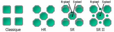 Fotoelement o kształcie ośmiokąta i rozmieszczeniu w kształcie plastra miodu pozwoliły na uzyskanie większej powierzchni dla każdego fotoelementu niż dla konwencjonalnej matrycy CCD tej samej wielkości (rysunek 19). W ten sposób powstały matryce serii Super-CCD, a standardowa wersja określana jest jako Super-CCD HR. Dla uzyskania szerszego zakresu natężenia światła opracowano kolejne wersje przetworników tego typu wyposażonych w dwa różne typy fotoczujników. Elementy S mają większą powierzchnię i są bardzo czułe, uchwycą ciemniejsze i słabo widoczne elementy obrazu. Natomiast elementy R mają mniejszą powierzchnię i są mniej czułe ale mogą dostrzec szczegóły w jaśniejszych obszarach. W zależności od sposobu rozmieszczenia tych pikseli rozróżniamy matryce w wersji SR i SR II (rysunek 20).