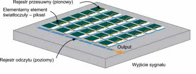 Matryca ma postać krzemowej płytki składającej się, przede wszystkim, z regularnego układu odizolowanych, światłoczułych komórek, które będziemy nazywali pikselami. Jej uproszczona budowa została pokazana na rysunku 1.