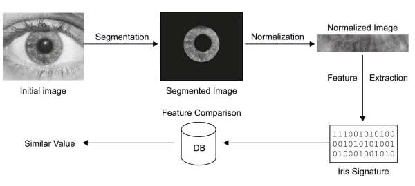 - Akwizycja danych – pobranie informacji, w przypadku analizy obrazu tęczówki, polega na sfotografowaniu oka za pomocą kamery wyposażonej w obiektyw makro i system oświetlenia bezcieniowego.