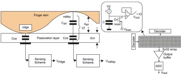 Czujniki pojemnościowe – bazują na półprzewodnikowej matrycy mikroskopijnych elektrod, działających podobnie do klasycznych sensorów dotykowych. Mikrometrowe różnice odległości pomiędzy zagłębieniami i fałdami skóry a powierzchnią czujnika są wykrywane dzięki różnicom pojemności wypadkowej poszczególnych komórek matrycy (rysunek 8).