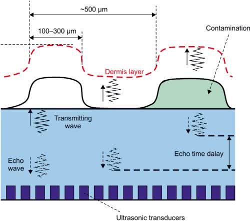 Czujniki ultradźwiękowe – bazują na zjawisku odbicia (echa) wiązek ultradźwięków, generowanych przez matrycę miniaturowych przetworników i wysyłanych do powierzchni czujnika w kierunku prostopadłym do powierzchni elementu, za którym ukryty jest sensor – np. ekranu smartfona (rysunek 9). Z tego też względu czujniki ultradźwiękowe należą do klasy rozwiązań typu in-display sensor i co ciekawe, w mediach pojawiają się już doniesienia o zastosowaniu tej nowoczesnej technologii w komercyjnie dostępnych urządzeniach mobilnych.