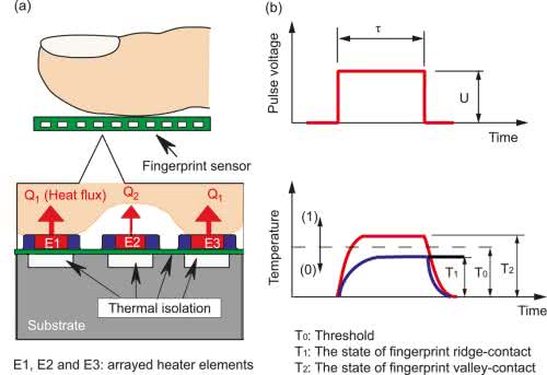 Czujniki termiczne – podobnie jak czujniki ultradźwiękowe i pojemnościowe, także bazują na matrycy mikrosensorów, które jednak w tym przypadku mają postać miniaturowych grzałek (rysunek 10). Im lepszy kontakt ma dana grzałka z obszarem skóry, tym niższą osiąga temperaturę, co pozwala na stworzenie mapy termicznej analizowanego obszaru. Czujniki termiczne nie zdobyły jak na razie popularności porównywalnej z ich optycznymi i pojemnościowymi odpowiednikami.