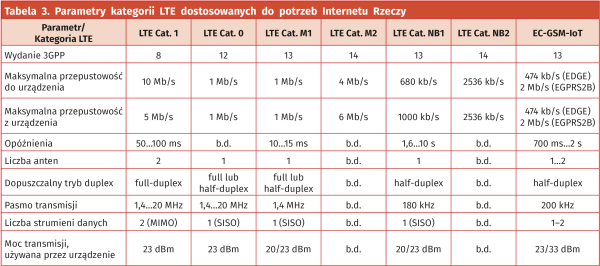 O aplikacjach typu IoT pomyślano w 8. wersji specyfikacji, tworząc kategorię 1. Niestety, nie spełnia ona wymagań wielu projektów IoT, oferując niepotrzebnie dużą przepustowość, przy jednoczesnym wcale nie tak małym poborze mocy. Dlatego w wydaniu 12. specyfikacji wprowadzono kategorię 0, która cechowała się już 10-krotnie mniejszą przepustowością do urządzenia, równą przepustowości w kierunku do stacji bazowej i wynoszącą 1 Mb/s. Ale największe zmiany pojawiły się w wydaniu 13., w którym dodano kategorie M1 i NB-IoT1 oraz EC-GSM-IoT. Natomiast w kolejnym, 14. już wydaniu, dodano jeszcze kategorię M2 i NB-IoT2. LTE pokrywa ogromną część obszaru wielu państw, ale poszczególne kategorie LTE bardzo się od siebie różnią. Dlatego przed wyborem modułu/modemu do pracy w tym systemie należy upewnić się, że sieć obsługuje wymagane kategorie.