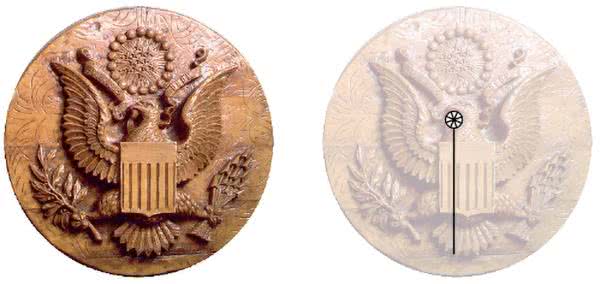W roku 1946 delegacja radzieckich Pionierów podarowała ambasadorowi USA w Moskwie dwumetrową drewnianą replikę wielkiej pieczęci stanów zjednoczonych (fotografia 3) [13]. Ambasador zawiesił pieczęć w swoim gabinecie na ścianie koło biurka. Eksperci ocenili, że nie ma czego się bać. Wprawdzie znaleziono wzbudzający pewne podejrzenia drucik, ale ponieważ przebiegał w miejscu spojenia drewnianych płyt, to na pewno nie mógł pozwalać na podsłuch. Jednak potem okazało się, że Sowieci wiedzieli wszystko o rozmowach ambasadora w gabinecie.