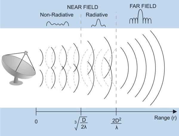 Zachowanie fal elektromagnetycznych zależy w dużym stopniu od odległości od anteny nadawczej [4], dlatego istotny jest podział na dwa obszary: bliskiego i dalekiego pola. Podczas gdy wzór fali elektromagnetycznej w polu dalekim jest stosunkowo jednorodny, w polu bliskim elementy elektryczne i magnetyczne są bardzo silne i niezależne tak, że jeden element może dominować nad drugim. Obszar bliskiego pola jest uważany za przestrzeń, która leży do odległości Fraunhofera, a obszar dalekiego pola leży poza tą odległością. Rozkład obszarów bliskiego i dalekiego pola został pokazany na rysunku 1, gdzie D to maksymalny wymiar promiennika (lub średnica anteny), a λ to długość fali elektromagnetycznej.