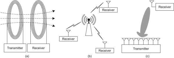 Systemy WPT bliskiego pola przesyłają energię przy pomocy cewek indukcyjnych (rysunek 2a), podczas gdy systemy dalekiego pola do nadawania i odbierania energii wykorzystują anteny dookólne (rysunek 2b) lub matryce anten do formowania wiązki (rysunek 2c).