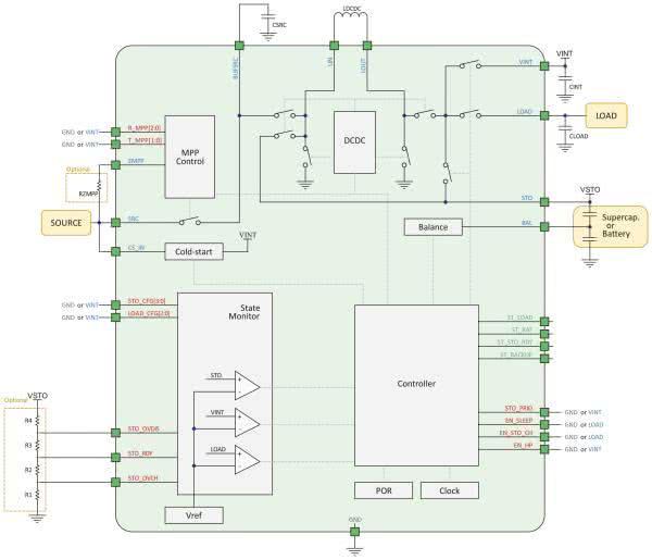 Układ integruje wszystkie elementy aktywne potrzebne do zasilania typowego modułu czujnikowego IoT. Wystarczy dołączyć trzy kondensatory i jeden dławik. Do wyprowadzenia STO musi być dołączony akumulator lub kondensator o pojemności minimum 100 μF. W przeciwnym wypadku układ może zostać zniszczony. Kondensator na wyjściu LOAD (min 40 μF) redukuje poziom tętnień oraz poprawia pracę przy obciążeniach impulsowych.