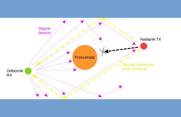 - urządzenie odbiorcze wysyła sygnał nawigacyjny - beacon, krótki (dziesiątki mikrosekund), sygnał o małej mocy (około 5 mW), zawierający identyfikator urządzenia;