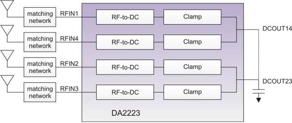 - Układy DA2210 i DA2223 - są wyposażone w cztery ścieżki odbiorcze RF-DC, co umożliwia podłączenie od 1 do 4 anten w zależności od wymaganej mocy i dostępnej anteny (rysunek 6). Anteny mogą być na tyle małe, że mieszczą się w wewnątrz usznych aparatów słuchowych. Zarówno DA2210, jak i DA2223 posiadają zewnętrzne dopasowanie wejścia RF dla większej elastyczności i wydajności konwersji RF do DC. Wyjścia DC układu mają ograniczniki napięcia wyjściowego. Układ DA2223 ma połączone razem po dwa wyjścia DC oraz mniejszą obudowę 1,69×1,39×0,5 mm;