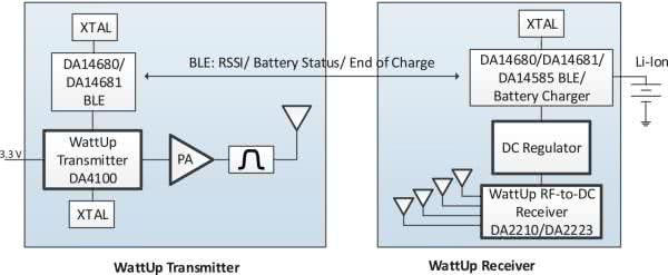System Near Field WattUp firmy Dialog Semiconductor składa się z bezprzewodowego nadajnika mocy WattUp (DA4100), bezprzewodowego wzmacniacza mocy WattUp (DA3210), bezprzewodowego odbiornika mocy WattUp (DA2210 lub DA2223), regulatora DC, akumulatora Li-Ion/Li-Poly i ładowarki (rysunek 7) [18].