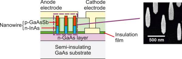 Japońska Agencja Naukowo-Techniczna (JST), Fujitsu Limited i Tokyo Metropolitan University opracowały bardzo czuły element prostowniczy w postaci diody wstecznej na nanodrutach (nanowire), która może przekształcać mikrofale o małej mocy w energię elektryczną [11]. W przeciwieństwie do konwencjonalnych diod Schottky’ego, diody wsteczne mają stromo nachyloną charakterystykę prostowniczą z zerową polaryzacją. Na półprzewodnikowym podłożu powstały niezwykle cienkie nanodruty o szerokości około jednej tysięcznej włosa (rysunek 9).