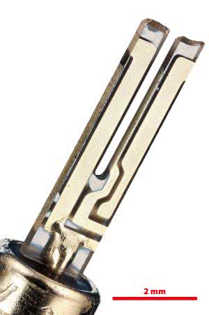 Podczas gdy płytki AT-cut wykorzystują drgania ścinające (thickness-shear vibrations), rezonatory typu tuning-fork, jak sama nazwa wskazuje, działają w sposób bardzo zbliżony do popularnego kamertonu. Co więcej – rozwidlony kształt płytki kwarcowej (fotografia 5) do złudzenia przypomina ten prosty przyrząd, używany do strojenia instrumentów muzycznych.