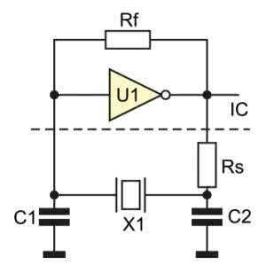 Zasada działania rezonatora kwarcowego opiera się na rezonansie mechanicznym płytki kwarcowej, który dzięki właściwościom piezoelektrycznym jest niejako „sprzężony” z rezonansem elektrycznym – impedancja rezonatora maleje bowiem drastycznie przy zbliżaniu się do częstotliwości charakterystycznej. W codziennej praktyce konstruktorskiej niemal wszystkie aplikacje rezonatorów kwarcowych są zatem zbudowane w oparciu na oscylatorze harmonicznym Pierce-Gate, którego schemat prezentuje rysunek 1.