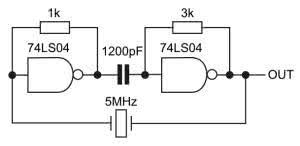 Rysunek 4 prezentuje prosty, dwubramkowy oscylator z dwupoziomowym sprzężeniem zwrotnym. Rezystory o wartościach 1 kΩ i 3 kΩ linearyzują poszczególne bramki, które połączone są ze sobą zmiennoprądowo za pomocą kondensatora. Całość układu jest zamknięta drugą pętlą sprzężenia zwrotnego, w którego roli występuje sam oscylator. Warto zwrócić uwagę, że kryterium fazy Barkhausena zostało tutaj spełnione dzięki 180-stopniowym przesunięciom fazy, wprowadzanym przez połączone kaskadowo bramki – całość oferuje zatem niezbędne przesunięcie równe 360°. Układ jest przeznaczony do pracy z elementami typu AT-cut.