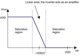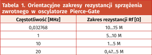 Rezystor sprzężenia zwrotnego (Rf) – zadaniem rezystora Rf jest wprowadzenie ujemnego sprzężenia zwrotnego, które linearyzuje negator, lub – innymi słowy – przesuwa jego punkt pracy do zakresu liniowego, „rozciągniętego” w porównaniu do negatora pozbawionego sprzężenia i czyni go w ten sposób... prostym wzmacniaczem CMOS (rysunek 3). Zalecana wartość rezystora Rf maleje wraz z częstotliwością pracy – przykładowe orientacyjne zakresy zostały pokazane w tabeli 1.