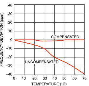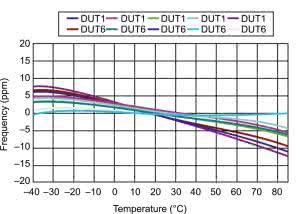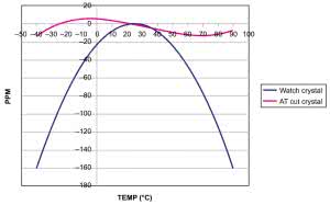 Wspomniany wcześniej silny wpływ warunków otoczenia na pracę rezonatorów kwarcowych zobrazowano na rysunku 8, prezentującym zależność częstotliwości względnej (odniesionej do wartości nominalnej) od temperatury. Jak widać, w przypadku rezonatorów typu tuning-fork charakterystyka ma postać paraboliczną, z wierzchołkiem kalibrowanym (co nie dziwi) dla temperatury pokojowej.