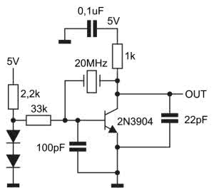 Prosty generator Pierce’a pokazany na rysunku 5 uważnym Czytelnikom przywoła na myśl schematy, doskonale znane z podręczników elektroniki sprzed kilku dekad. W gruncie rzeczy, sam układ działa na niemal identycznej podstawie, jak opisany szeroko układ Pierce-Gate – w roli zlinearyzowanego negatora o 180-stopniowym przesunięciu fazy pracuje tutaj pojedynczy tranzystor bipolarny, spolaryzowany prostym źródłem prądowym tworzonym przez szeregowe diody, rezystory 2,2 kΩ i 33 kΩ oraz złącze baza-emiter tranzystora.