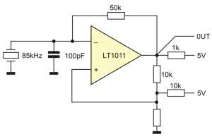 Układ z rysunku 6 bazuje na scalonym komparatorze i – co ciekawe – należy do grupy oscylatorów relaksacyjnych (w odróżnieniu od harmonicznych, wśród których prym wiedzie topologia Pierce’a). Klasyczny schemat generatora RC, znany z licznych not aplikacyjnych i podręczników, został tutaj wzbogacony rezonatorem, włączonym równolegle do kondensatora tworzącego układ RC z rezystorem sprzężenia zwrotnego. Wartości elementów pasywnych układu dobrane zostały w taki sposób, by samorzutna relaksacja multiwibratora (tj. bez obecności rezonatora) była nieznacznie szybsza (5...10%) niż nominalna częstotliwość rezonatora – zbliżenie do punktu rezonansu powoduje „podkradanie” energii z układu RC, co wymusza generowanie przez układ oscylacji o pożądanej częstotliwości.