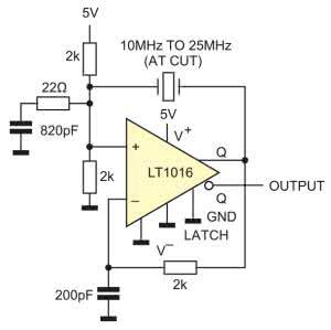 Warto przeanalizować także topologię przedstawioną na rysunku 7 – bez rezonatora układ byłby „zwyczajnym”, szerokopasmowym wtórnikiem napięcia o GBW na poziomie 50 GHz. Włączenie oscylatora kwarcowego pomiędzy wyjście komparatora a dzielnik napięcia, polaryzujący jego wejście nieodwracające, wprowadza do układu dodatnie sprzężenie zwrotne, „faworyzujące” częstotliwość rezonansową rezonatora i wymuszające rozpoczęcie generowania oscylacji. Dodatkowa sieć RC złożona z rezystora 22 Ω i kondensatora 820 pF tłumi wyższe częstotliwości, nie dopuszczając do pracy rezonatora w tzw. trybie overtone, czyli z częstotliwością harmoniczną wyższego rzędu (ten tryb pracy bywa jednak czasem używany w układach bazujących na rezonatorach AT-cut).
