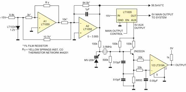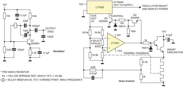 Doskonałe dokładności osiągane przez oscylatory z kompensacją temperaturową w niektórych zastosowaniach są nadal niewystarczające. Problem dotyczy głównie (choć nie tylko) urządzeń pracujących w trudnych warunkach, przy dużej zmienności temperatur, a nierzadko także w narażeniu na wstrząsy i wibracje. Słusznym skojarzeniem będą tutaj wszelkiej maści technologie wojskowe – sprzęt radiokomunikacyjny, systemy radarowe, czy też systemy zarządzania polem walki – a także przemysł lotniczy i kosmiczny. W tych aplikacjach zastosowanie znajdują oscylatory OCXO (Oven Controlled Crystal Oscillator). W ich przypadku mamy już do czynienia nie tylko z precyzyjnym strojeniem fabrycznym, ale także aktywną regulacją temperatury rezonatora kwarcowego, korzystającą z miniaturowego termostatu oraz układu grzałek, sprzężonych termicznie z obudową rezonatora. Budowę przykładowego OCXO obrazuje schemat, zaczerpnięty z wielokrotnie już przywoływanej noty aplikacyjnej Linear Technology (rysunek 11).