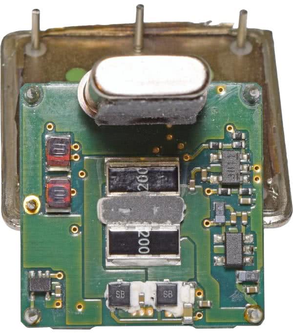 Choć współczesne OCXO bazują już na nieco innych rozwiązaniach układowych, zwłaszcza w zakresie części oscylacyjnej, to zasada działania pozostaje niezmienna – precyzyjny termostat reguluje w pętli ujemnego sprzężenia zwrotnego temperaturę grzałek oporowych, korzystając z wbudowanego czujnika temperatury, znajdującego się także w ścisłym otoczeniu samego rezonatora. Wnętrze nowoczesnego OCXO można zobaczyć na fotografiach 9 i 10.