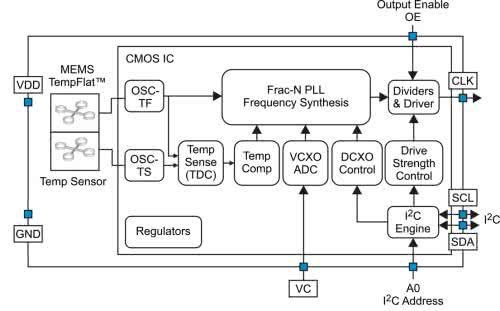 Innym, niezwykle ciekawym przykładem generatora scalonego w technologii mikroelektromechanicznej jest układ SiT5348 tego samego producenta (fotografia 9). Ten doskonale dopracowany i silnie rozbudowany układ (schemat blokowy został pokazany na rysunku 14) oferuje ultraprecyzyjną stabilizację częstotliwości ±50 ppb w zakresie 0…+70°C!, niski jitter na poziomie 0,31 ps oraz niebywałą wprost odporność na wibracje i przeciążenia – dryf częstotliwości w funkcji narażeń mechanicznych to zaledwie 0,009 ppb/g. Co ciekawe, SiT5348 występuje w trzech wersjach: jako klasyczne TCXO (ze stałą częstotliwością oscylacji), VCTCXO (czyli… TCXO przestrajane napięciowo, stanowiące zatem „lepszą” wersję VCXO) oraz DCTCXO.